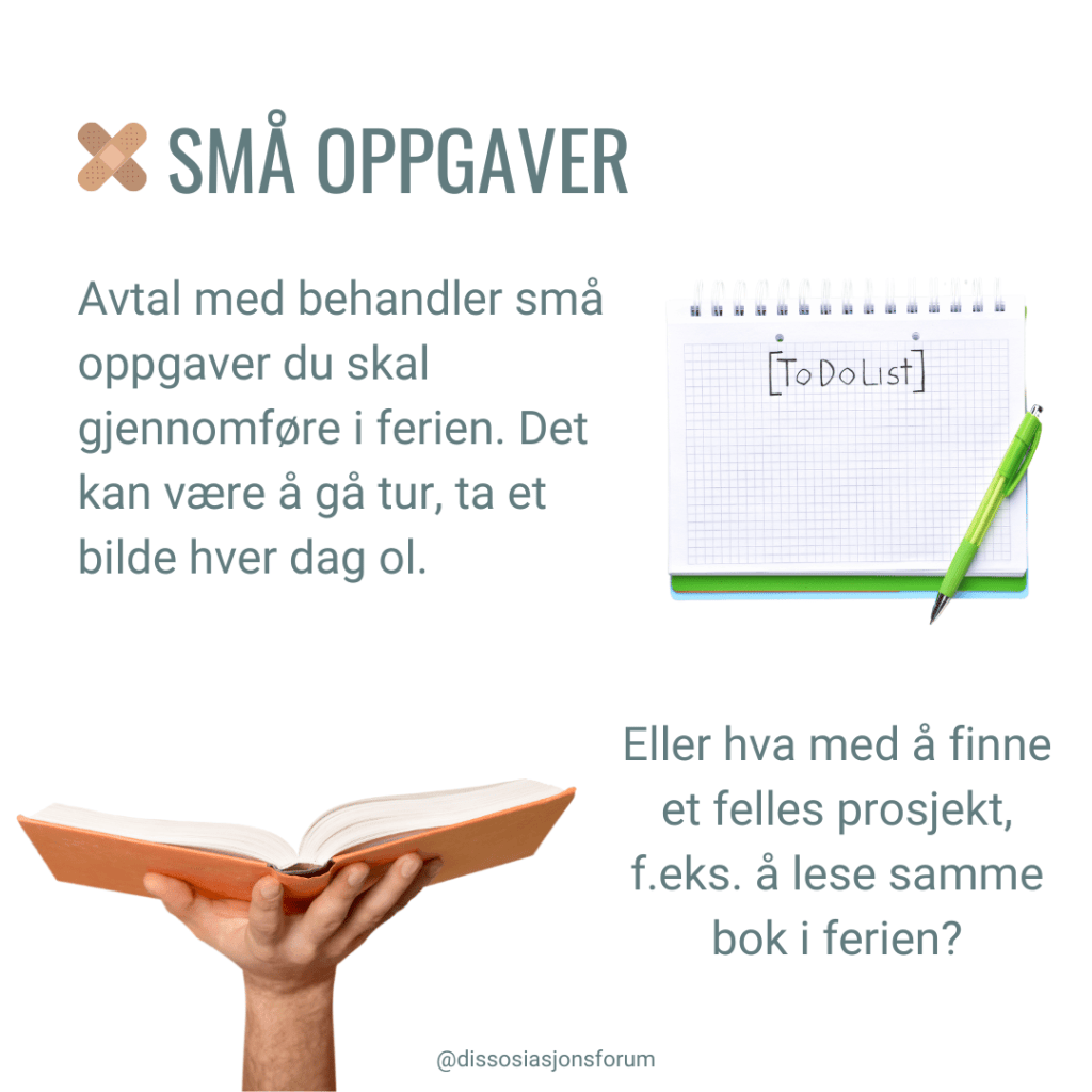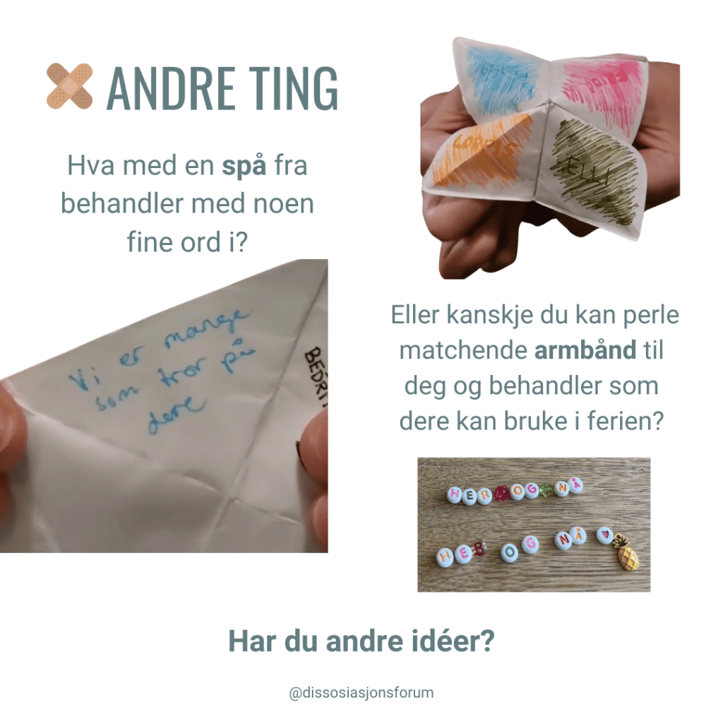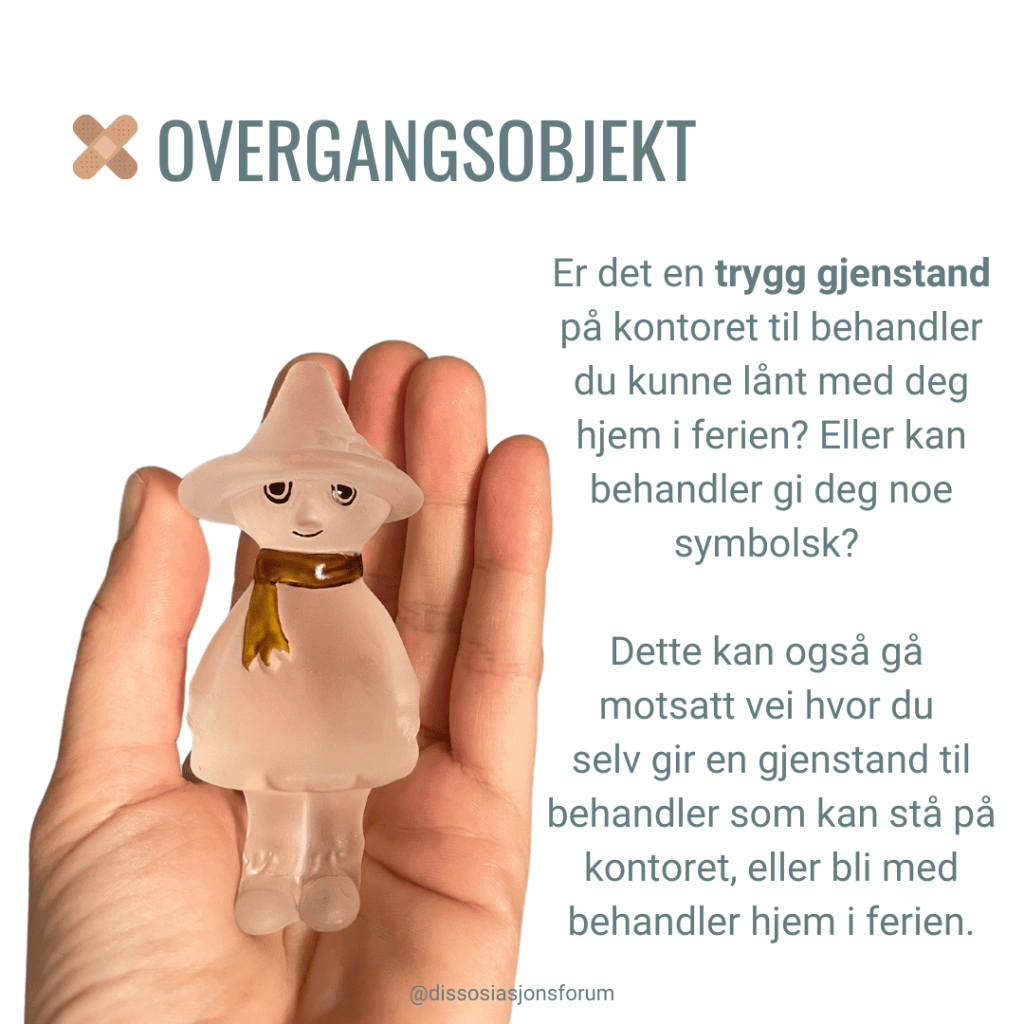 Vi har derfor samlet noen verktøy som kan gjøre ferien LITT mer håndterbar. Hensikten med disse er å få hjelp til å regulere seg, til tross for behandlers fravær, og dermed erfare at man faktisk klarer å gjøre dette på egen hånd. Det er også en måte å opprettholde tilknytningen til behandler, som gjerne er ganske skjør for mennesker med relasjonstraumer og har lite erfaring med trygg tilknytning.