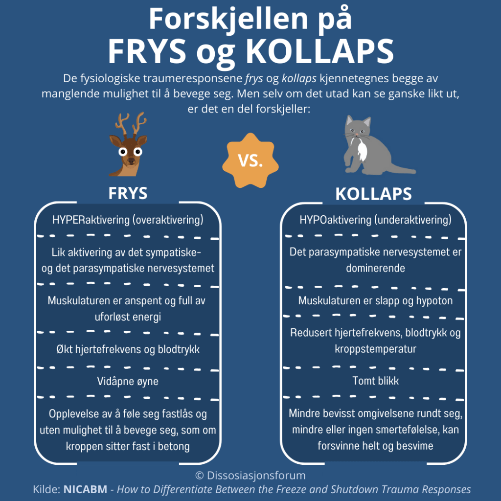 De aller fleste har hørt om traumeresponsene kamp, flukt og frys (fight/flight/freeze), men responsen kollaps (eller å spille død) blir sjeldnere nevnt. Vi med dissosiative lidelser vil ofte ha erfaringer med kollaps fra oppveksten, og dette vil kunne følge oss og trigges frem igjen i voksen alder, selv om faren reelt sett er over.