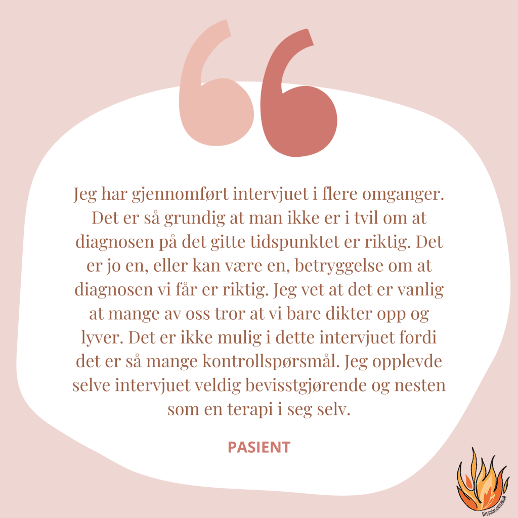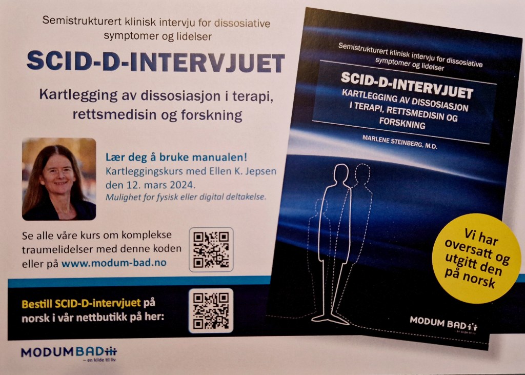 I dag skal Ellen Jepsen ha veiledning i bruk av den oversatte utgaven av SCID-D kartleggingen og jeg håper at mange har meldt seg på. På samme dag som jeg skal ha undervisning på mitt lokale sykehus med turnusleger og medisinstudenter som absolutt vil møte mange av denne brukergruppen i løpet sin karriere.