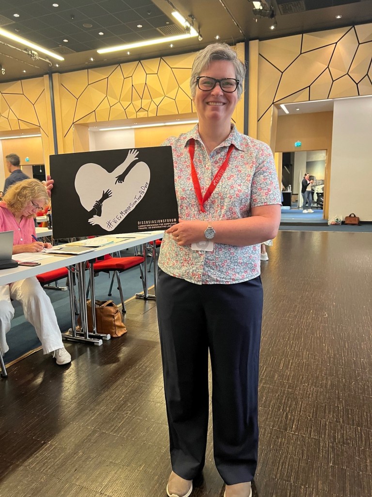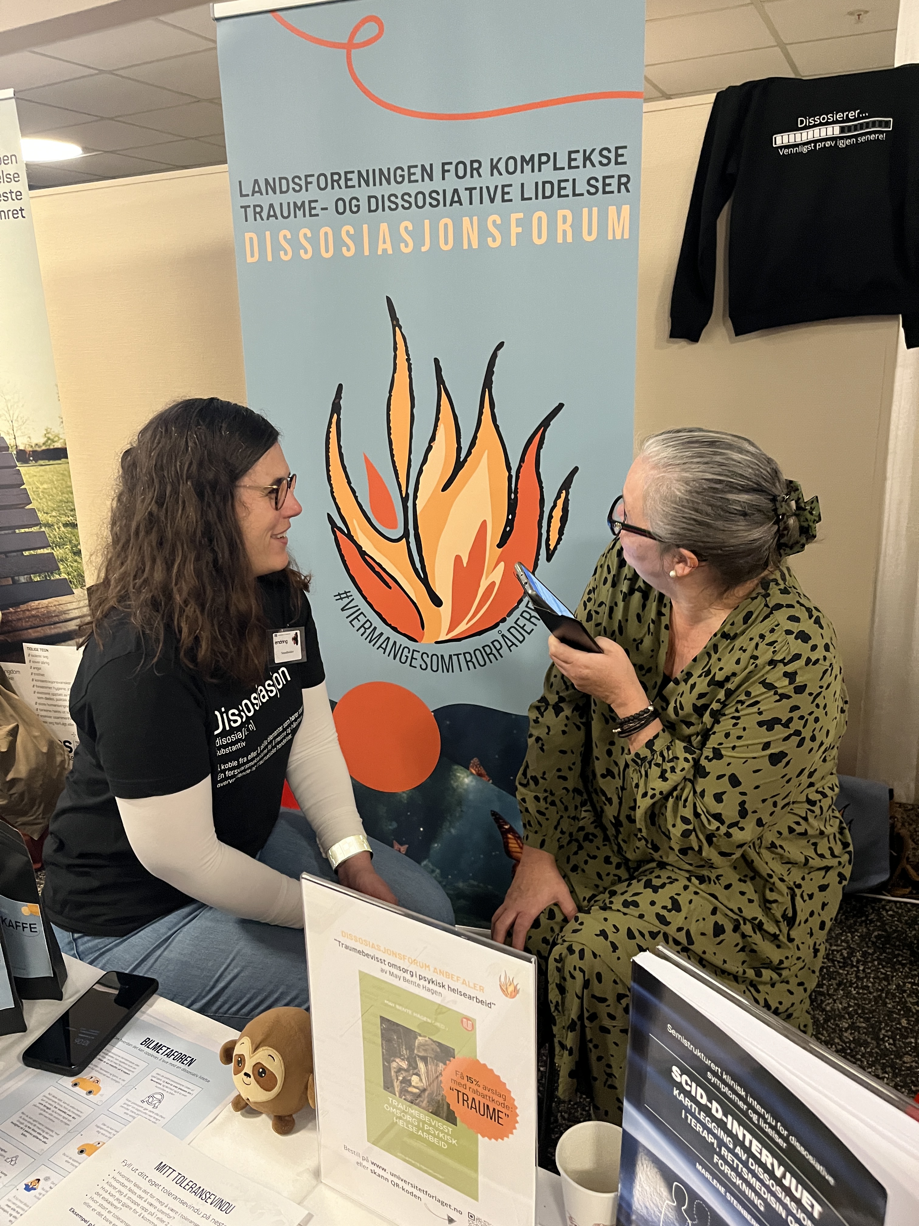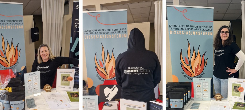 Dissosiasjonsforum – LKTD deltok på Schizofrenidagene som standholdere for første gang i år. Formålet med å delta på stand var å bli mer synlig som organisasjon. Vi ønsker naturligvis å vise fram hvem vi er, hvem vi representerer og hva vi jobber for. Det er på høy tid at komplekse traume – og dissosiative lidelser blir mer åpent og kjent og dette er absolutt et tiltak vi tenker å fortsette med når anledningene byr seg. Vi hadde liten erfaring med å stå på stand fra før, men vi forberedte oss med å trykke opp brosjyrer, visittkort, printet ut diverse verktøy fra ressursbanken vår, ICE kortene våre. Vi reklamerte også for Scid-d manualen og fikk levert lapper om nytt kurs fra Modum og Ellen Jepsen via Peter Sele som ydmykt spurte om vi kunne opplyse om neste kurs og muligheter for påmelding. Selvsagt ville vi det!