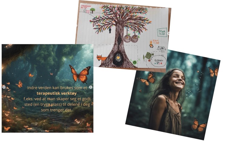 Forskjellen ble et par instagramposter på @dissosiasjonsforum ( «indre verden» og «kart over indre landskap»). Som så ofte før spiller det en enorm rolle å se at ulike innsendere faktisk bekrefter det som psykologen hele tiden har sagt. Det kom eksempler på indre verdener som så ut som alt fra «dataspill» til «Narnia» og «teater». Ingen fasitsvar, altså.