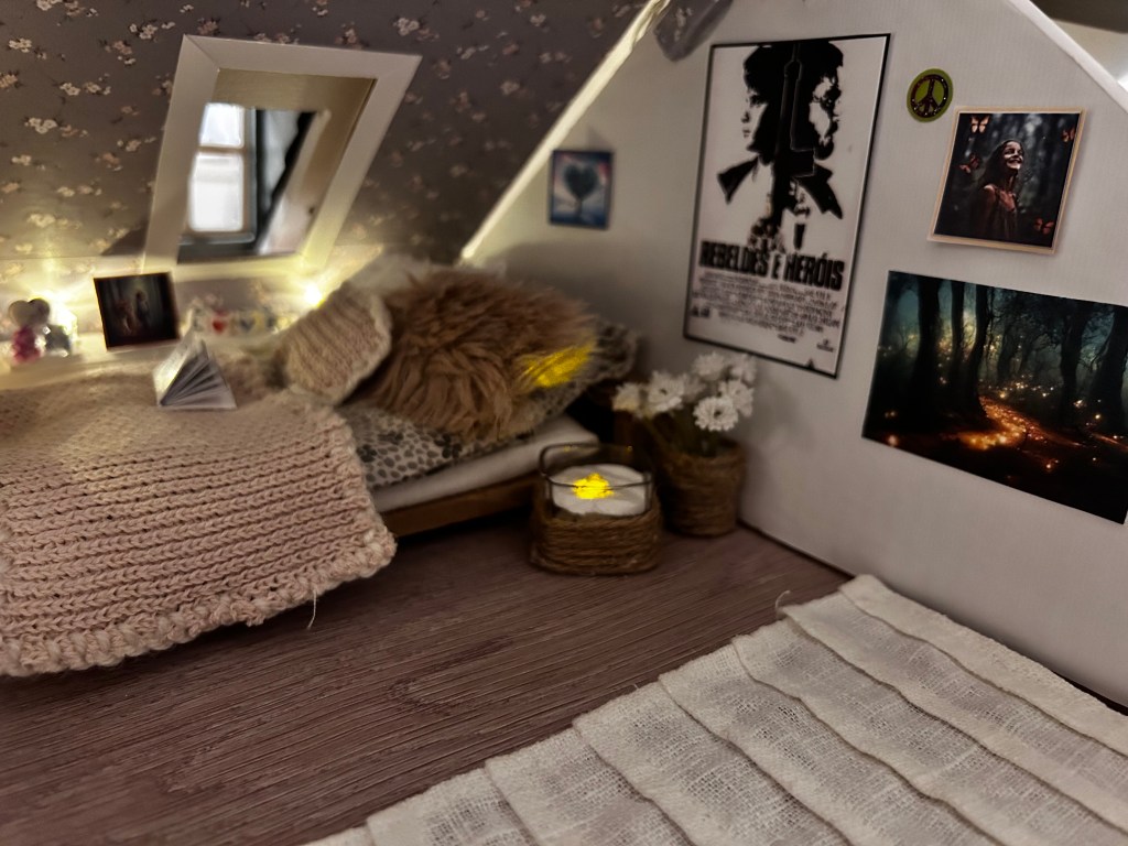Egentlig tenkte jeg at Det Trygge Rommet skulle innredes smakfullt, delikat og stilig. Det skulle ha kule plakater og vakre bilder, som skulle vitne om å være tøff og ha god smak. Men så koblet liksom tenkehjernen seg av hver gang jeg syslet med rommet. Jeg følte, mer enn tenkte, mye på hva jeg pleide å like som barn (og da havnet jeg ubevisst på ca. 10-11 år). Og så «ble» rommet som det ble: en perfekt miks for en indre 11-åring (iallfall min)! Det er kanskje ikke voksensmak, eller din smak, men jeg elsker det! Det er varmt, mykt og lunt, samtidig som det er lyst og åpent. Bildene på veggene er nøye utvalgt, og det viktigste: ingen dør inn og heller ingen innsyn utenfra. Bare på den måten kunne jeg føle at det var helt trygt.
