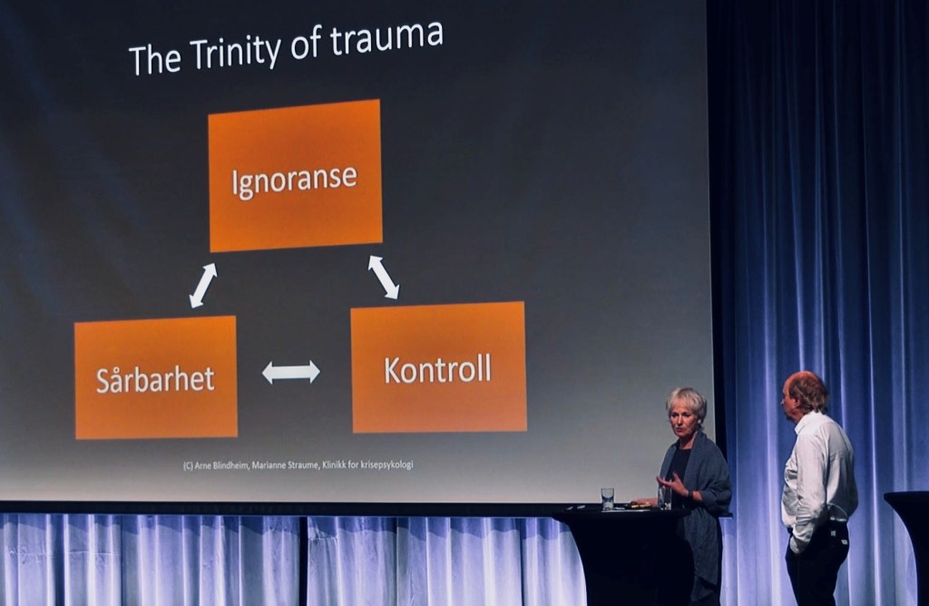 Etter Karen sitt innlegg tok psykologspesialistene Marianne Straume og Arne Blindheim oss over til voksne pasienter igjen. De snakket om hvordan mennesker med strukturell dissosiasjon jobber med å heles, ikke bare fra traumatiske hendelser, men fra traumatiske liv. De forklarte hvordan vi alle skaper vårt «jeg», med en opplevelse av oss selv og verden, og måter å handle deretter for å ivareta våre behov. De som har en strukturell dissosiativ lidelse her flere slike «jeg», med ulike opplevelser av seg selv og verden. De snakket også om hvordan traumatiserte skaper seg en mening i hva de opplever, og svært ofte forklarer det med feil hos seg selv. Dette for å bevare omsorgspersonene som snille. Samtidig har de traumeopplevelsene, og derfor oppstår de ulike selvtilstandene/delene som gjør at barnet kan leve videre i den verden de er i. Marianne og Arne hadde gitt foredraget sitt tittelen «The Trinity of Trauma». Med det mener de konflikten mellom ignoranse (unngåelse) – sårbarhet – kontroll. Og at det kan finnes flere ”deler“ i alle disse tre kategoriene. Målet er å få dette systemet til å fungere sammen som en helhet, og det krever at ignoransen må byttes ut med nysgjerrighet, og mot til å lytte innover. Til det trenger pasienten ofte at noen blir med dem inn i deres skremmende indre. Marianne sa at man som hjelper ofte får feilaktig beskjed om å lytte til det friske i pasienten. Det betyr som regel å lytte til ignoransen hos dissosiative pasienter. En slik tilnærming vil ikke bidra til å skape indre samarbeid.