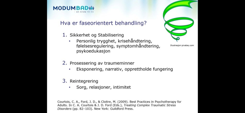 Ingunn Holbæk, psykologspesialist og PhD kandidat fra Traumepoliklinikken til Modum Bad, var neste innleder. Hun fortalte om forskning på behandling innen traumefeltet. Hun belyste diskusjonen rundt hvorvidt faseorientert behandling eller direkte eksponeringsterapi gir best resultater. Og at ulike studier viser at begge deler gir omtrent like god effekt ift. kompleks PTSD, men at det er store individuelle variasjoner. Enda finnes det lite forskning på strukturell dissosiasjon, men de få studiene som finnes tyder på at mennesker med dissosiative lidelser har best effekt av faseorientert behandling med fokus på integrering av de ulike delene. Ingunn har selv gjennomført en kvalitativ studie på effekten av de psykoedukative gruppene på Traumepoliklinikken, Modum Bad. Resultatene viser økt opplevelse av et sammenhengende jeg, og økte handlingsmuligheter og bedre kontroll. Ingunn nevnte til slutt en ny behandlingsmetode som potensielt kan gi raskere bedring enn det vi har i dag. Denne metoden heter Deep Brain Reorienting (DBR).