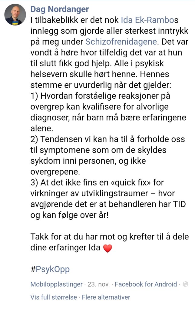 I tilbakeblikk er det nok Ida Ek-Rambos innlegg som gjorde aller sterkest inntrykk på meg under Schizofrenidagene. Alle i psykisk helsevern skulle hørt henne.
