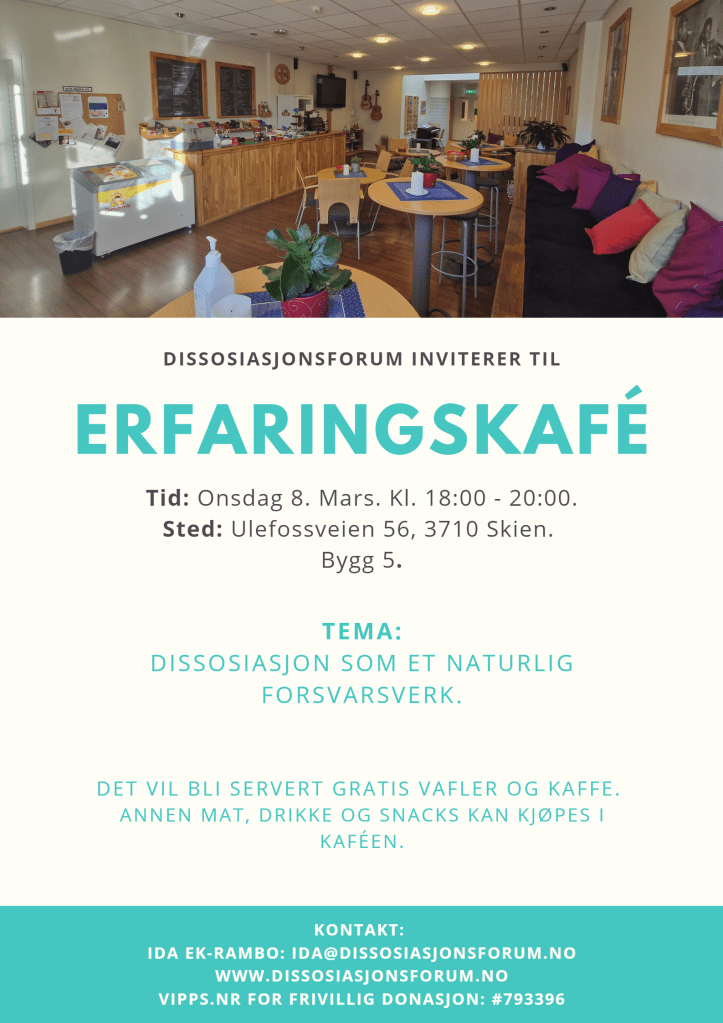Dissosiasjonsforum inviterer til vår første erfaringskafé! Med hensikt om å vise oss fysisk fram, ta opp viktige temaer, dele erfaringer og styrke samholdet blant vår brukergruppe. Ida vil stå for programmet med sitt kjente vesen og uten filter. Sammen med Rebekka, legger vi opp kvelden med panelsamtale, der det er rom for innspill og deling av erfaringer. Tema vil naturligvis være rettet mot komplekse traumelidelser og dissosiasjon. Det føles ofte fryktelig ensomt å lide under dissosiasjon som forsvar, men dette ønsker vi å motbevise. Åpenhet tror vi bidrar til mindre skam og mer følelsen av å egentlig være utstyrt med et naturlig forsvarsverk enn psykisk sykdom. Her er alt uhøytidelig, ærlig og ekte. Dem som ønsker å komme, trenger bare å være akkurat den de trenger å være der og da. Det er ingen forventninger til å delta aktivt. Her kan du bare lytte, spise vafler og drikke kaffe. Det viktigste er at vi står sammen og løfter hverandre opp. Gi litt håp og ny glød rundt vårt indre leirbålet som alle er velkomne til å sitte rundt. Vi har ikke ekte leirbål denne kvelden, men vi har lys på bordene og god atmosfære. Velkommen! Du er ikke alene.