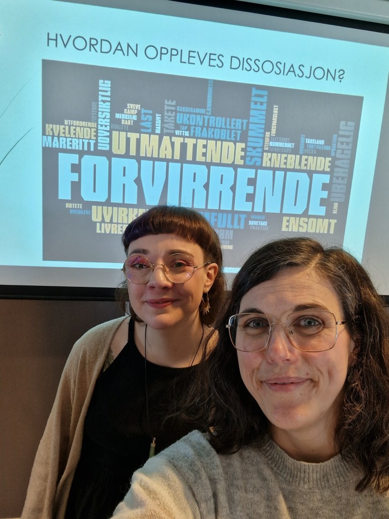 Ida tok med seg Jeanette som har mer erfaring med legevakt og akuttsituasjoner. Og de delte undervisningen opp i to. Der første del besto av grunnleggende teori om hvordan og hvorfor et menneske utvikler komplekse traumelidelser og dissosiasjon, og der andre del hadde fokus på hvordan dette kan se ut i praksis og hvordan vi tenker det er mest hensiktsmessig å møte det. Vi snakket om de ulike traumereaksjonene/responsene og om hvordan vi kan legge til rette for å forebygge eskalering ut ifra prinsippene vi kjenner til fra en traumebevisst tilnærming (Traumebevisst omsorg). Vi snakket også mye om kroppslige plager (kroppen husker), og de ansatte fikk tilsynelatende noen aha-opplevelser. Mange av de Ida snakker med har ofte sett Dissosiasjon og traumereaksjoner, uten å helt forstå hva det er, til de blir forklart mekanismene bak og kan forstå de bakenforliggende årsakene til den «bisarre» adferden. Fysiske symptomer uten medisinsk årsak, sammen med psykisk lidelse, kan gi et hint om mulig dissosiativ lidelse, forklarer Elle Jepsen som er psykiater og overlege på Modum Bad. Mange av oss som strever/har strevd med dissosiasjon, forteller om mange kroppslige plager og opplever å bli møtt med mistru og at vi overdriver når vi oppsøker legehjelp. Men det kan også være motsatt. Dissosiasjon, betyr jo nettopp å «koble vekk/ifra», så mange opplever og å bli nummen, koble vekk smerter og viktige symptomer som kan avdekke alvorlig somatisk sykdom. Dette gjør det naturligvis utfordrende å møte oss, ut ifra vanlig og allmenn vitenskap innen medisin.